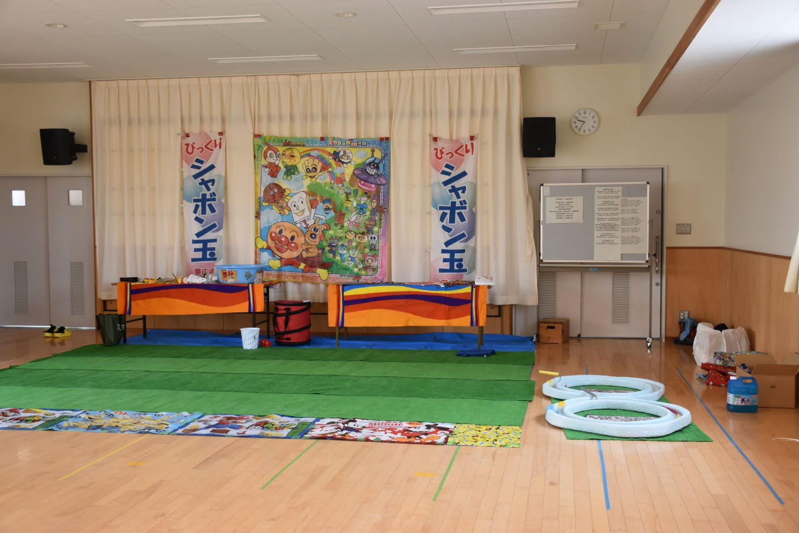 シャボン玉は無風だと下に落ちるだけです。ブルーシート・人工芝を持参して敷きます。
